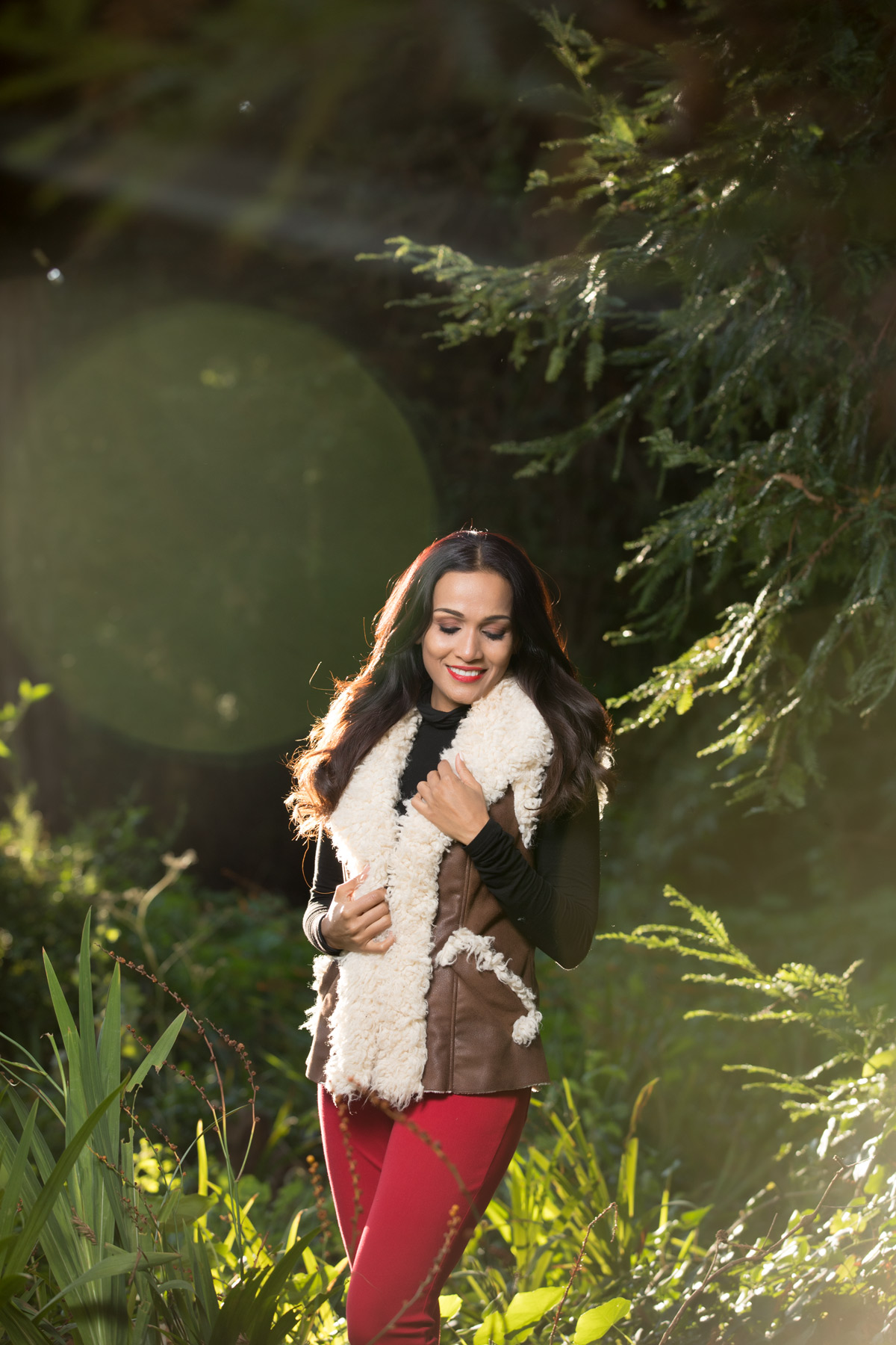 Cozy up and look stylish at the same time in this ultra soft and plush shearling vest by INC. It has pockets to keep your hands warm as well. Here I am wearing a slim fit turtleneck soft black tee paired with red jeggings perfect for the holidays. Add corset combat boots and this winter vest is perfect for a fun day out.